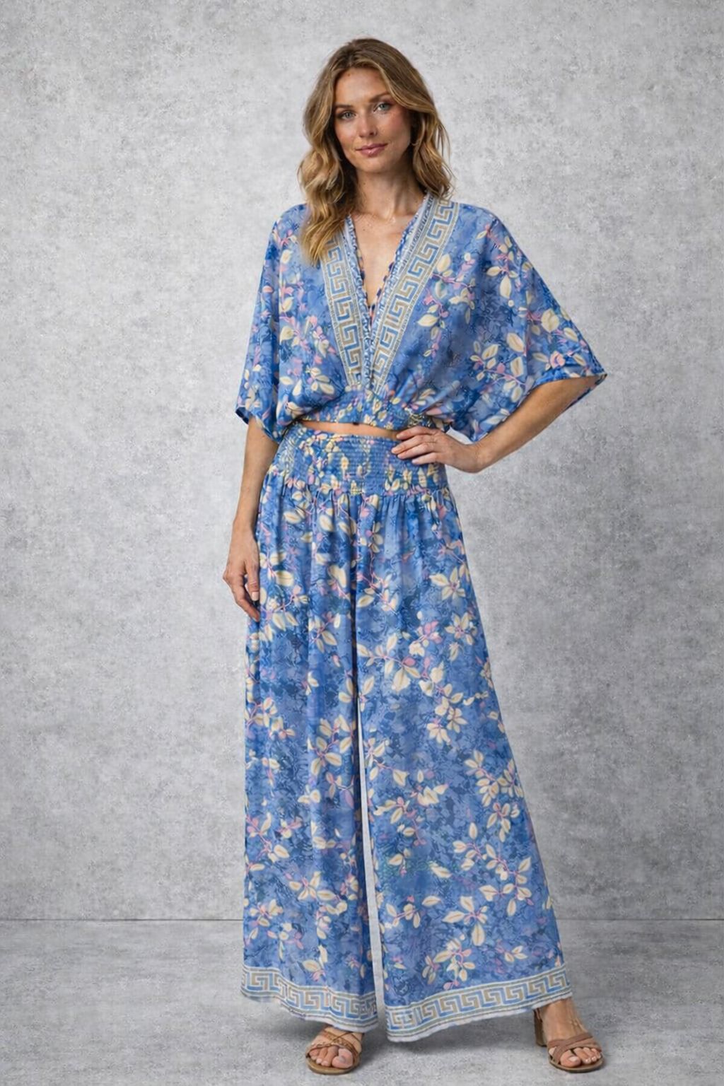 طقم مكون من بلوزة قصيرة الأكمام وبنطال من الفسكوز المطبوع