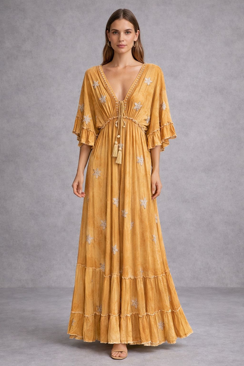 Maxi dress in a bohemian style with short sleeves and embellishments